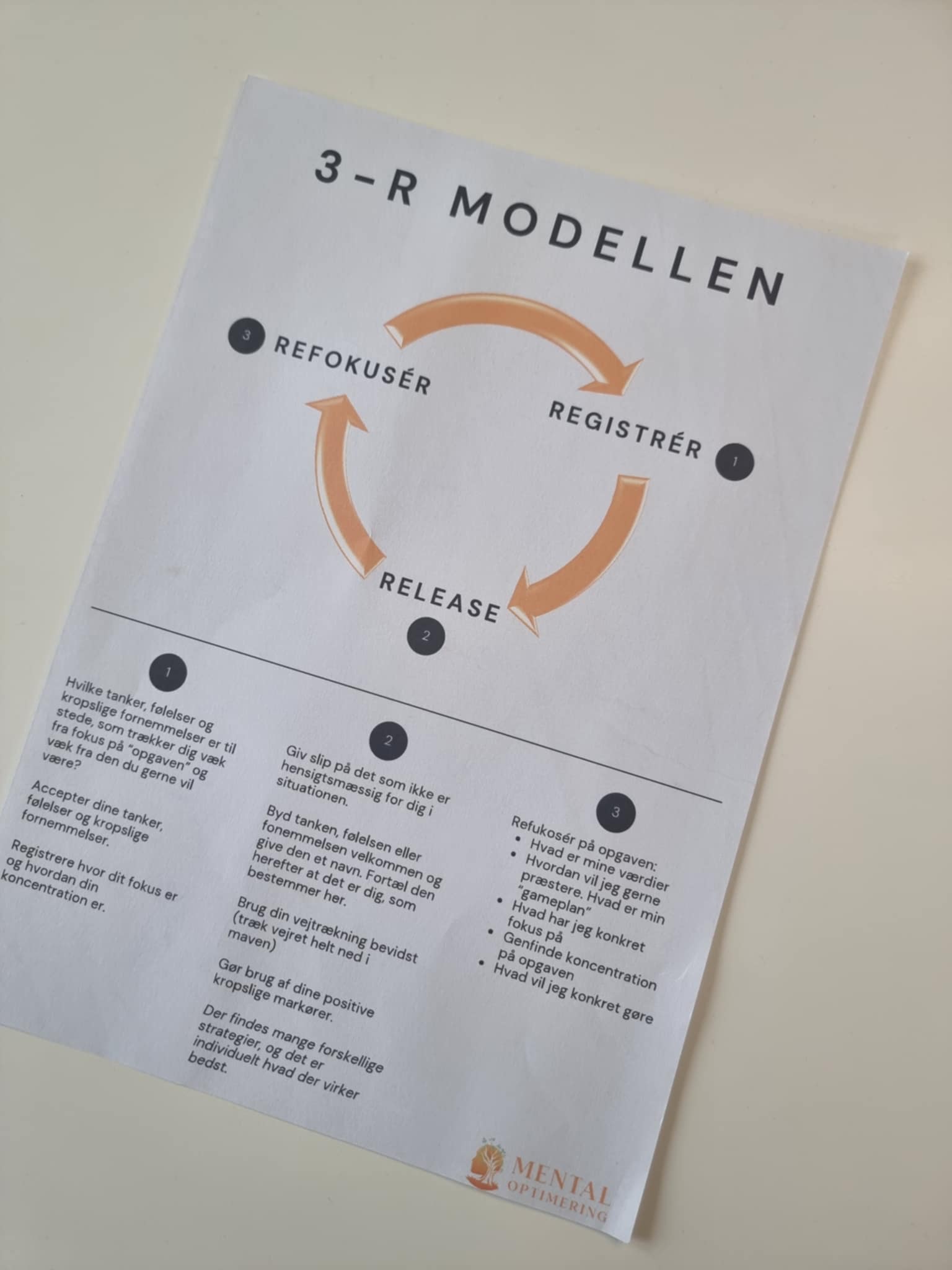 Modellens tre trin er:1. Registrér Bliv bevidst om, hvad der sker i dig. Hvad mærker du i kroppen? Hvilke tanker og følelser er i spil?Det første skridt mod forandring er altid bevidsthed. 2. Release Når du har registreret, handler det om at finde ro og regulere nervesystemet.Det kan fx være med åndedrættet, en sætning eller med dine positive kropsmakører, eller andet der hjælper dig med at give lidt slip.3. Refokusér Når der er mere ro, så spørg dig selv:Hvad vil jeg gerne gøre nu? Hvad er vigtigt for mig – lige her? Hvordan kan jeg handle i retning af mine værdier – i stedet for at blive styret af uro eller frygt?Klik på knappen nedenfor og download 3-R modellen.