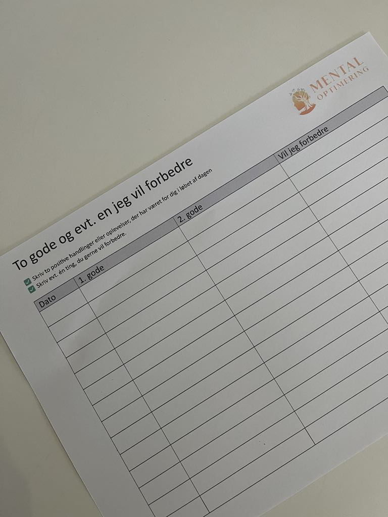En simpel, men effektiv øvelse, som kan hjælpe dig med at få et mere positivt mindset i din hverdag.Det kræver kun et par minutter, men kan gøre en kæmpe forskel!"-"Øvelsen går ud på, at du hver dag skriver: