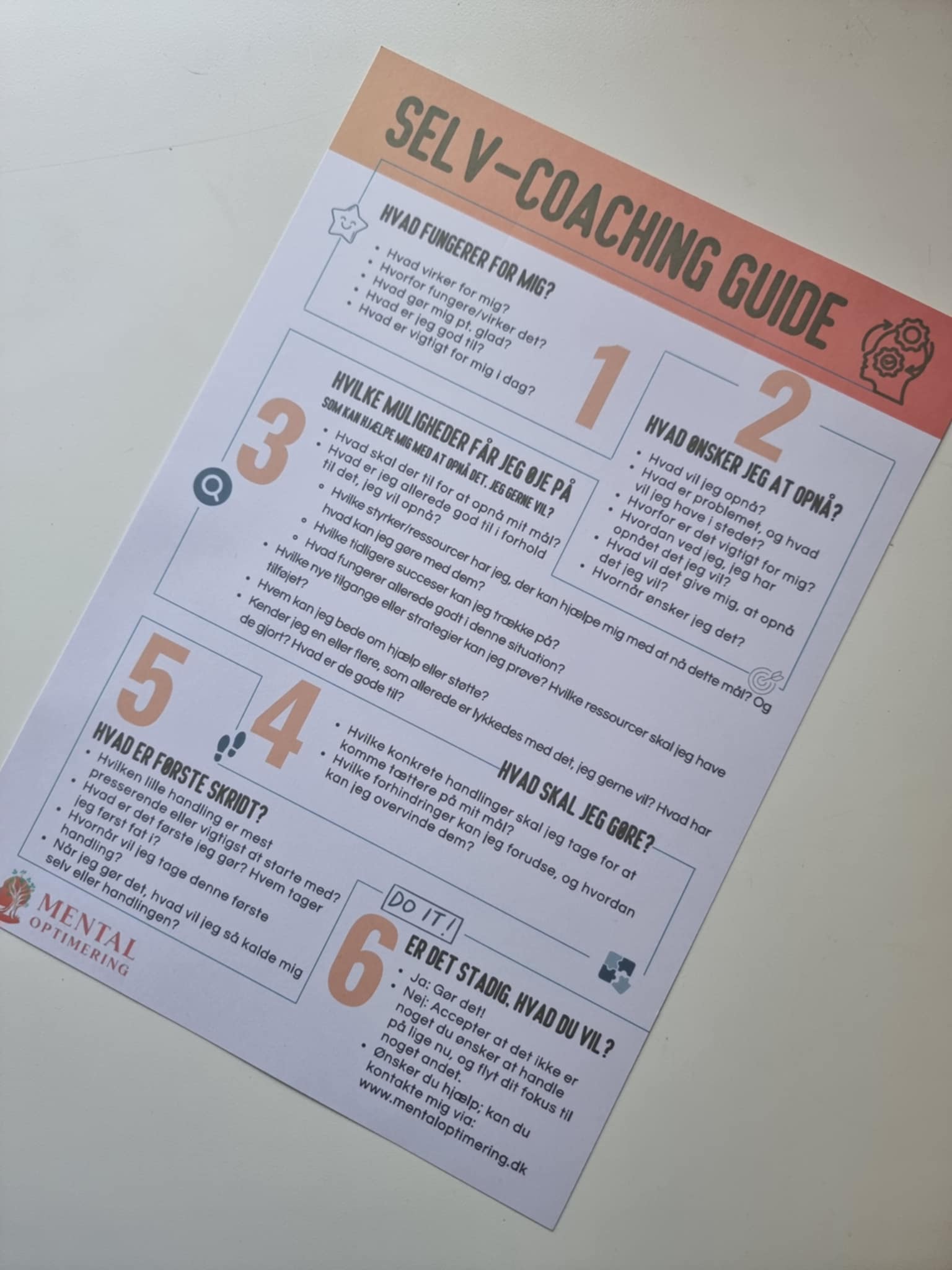 I hvert trin vælger du 1-3 refleksionsspørgsmål, som du stiller dig selv. Du starter med trin 1 og arbejder dig frem. Brug gerne god tid og vær ærlig – det er her forandring starter. Du kan downloade guiden ved at klikke på knappen nedenfor. Selvcoaching er et stærkt redskab til selvrefleksion – men det kan ikke erstatte den støtte og sparring, du får i en personlig coachingsamtale. Hvis du har brug for hjælp til at komme videre, står jeg klar. 📞 60 61 89 09📩 info@mentaloptimering.dk